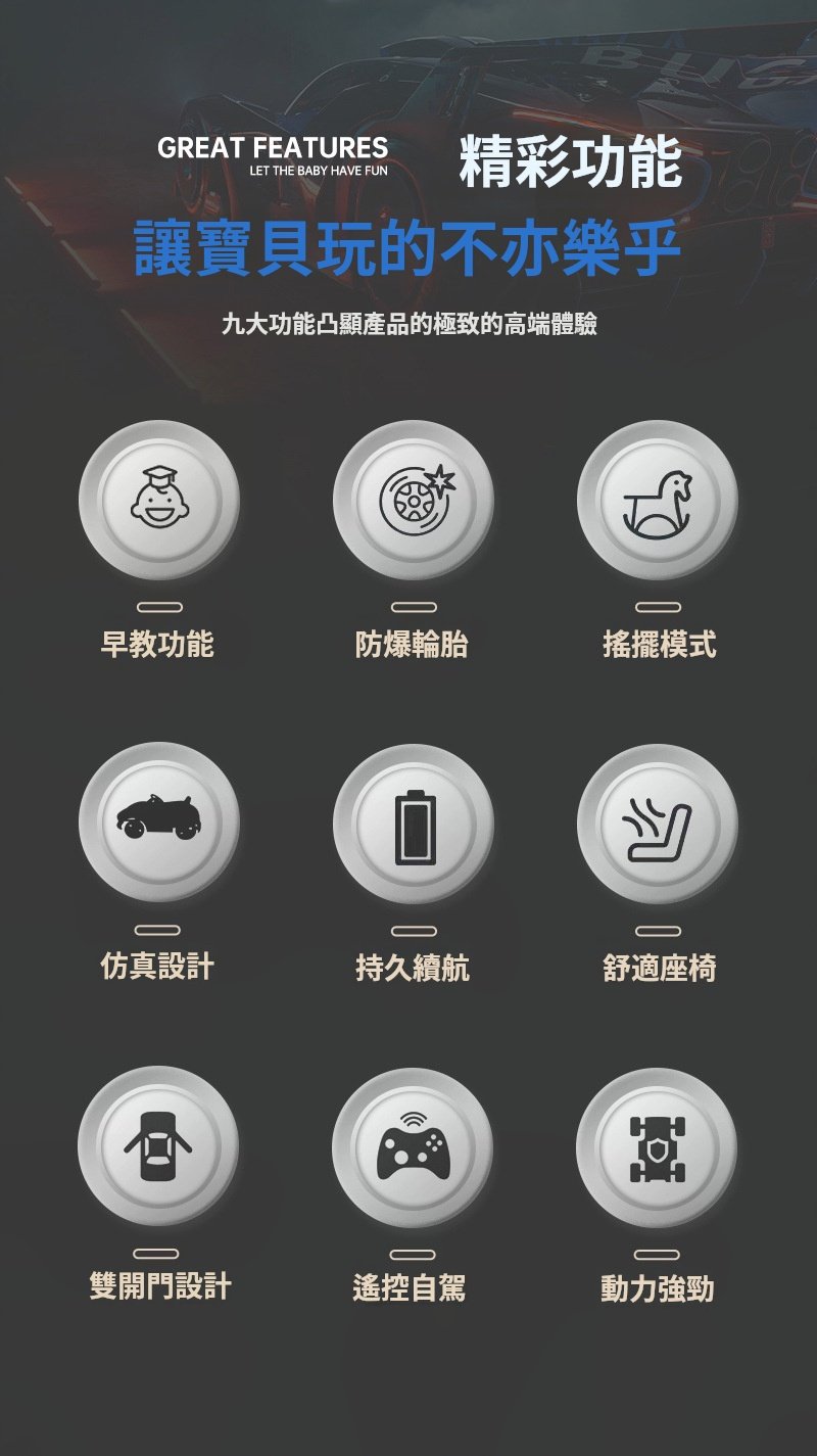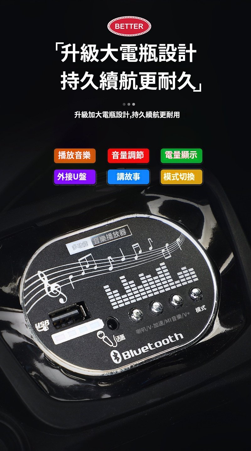 雙驅紅:藍牙歌曲+遙控自駕+搖擺, 雙驅白:藍牙歌曲+遙控自駕+搖擺, 雙驅藍:藍牙歌曲+遙控自駕+搖擺, 雙驅黃:藍牙歌曲+遙控自駕+搖擺, 雙驅紅:藍牙歌曲+遙控自駕搖擺+皮座, 雙驅白:藍牙歌曲+遙控自駕搖擺+皮座, 雙驅藍:藍牙歌曲+遙控自駕搖擺+皮座, 雙驅黃:藍牙歌曲+遙控自駕搖擺+皮座, 四驅紅:藍牙歌曲+遙控自駕搖擺+皮座, 四驅白:藍牙歌曲+遙控自駕搖擺+皮座, 四驅藍:藍牙歌曲+遙控自駕搖擺+皮座, 四驅黃:藍牙歌曲+遙控自駕搖擺+皮座, 四驅紅:藍牙+遙控自駕+皮座+推把, 四驅白:藍牙+遙控自駕+皮座+推把, 四驅藍:藍牙+遙控自駕+皮座+推把, 四驅黃:藍牙+遙控自駕+皮座+推把
