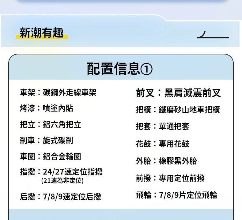 26寸/21速, 24寸/21速, 26寸/24速, 24寸/24速, 26寸/27速, 24寸/27速, 26寸/30速